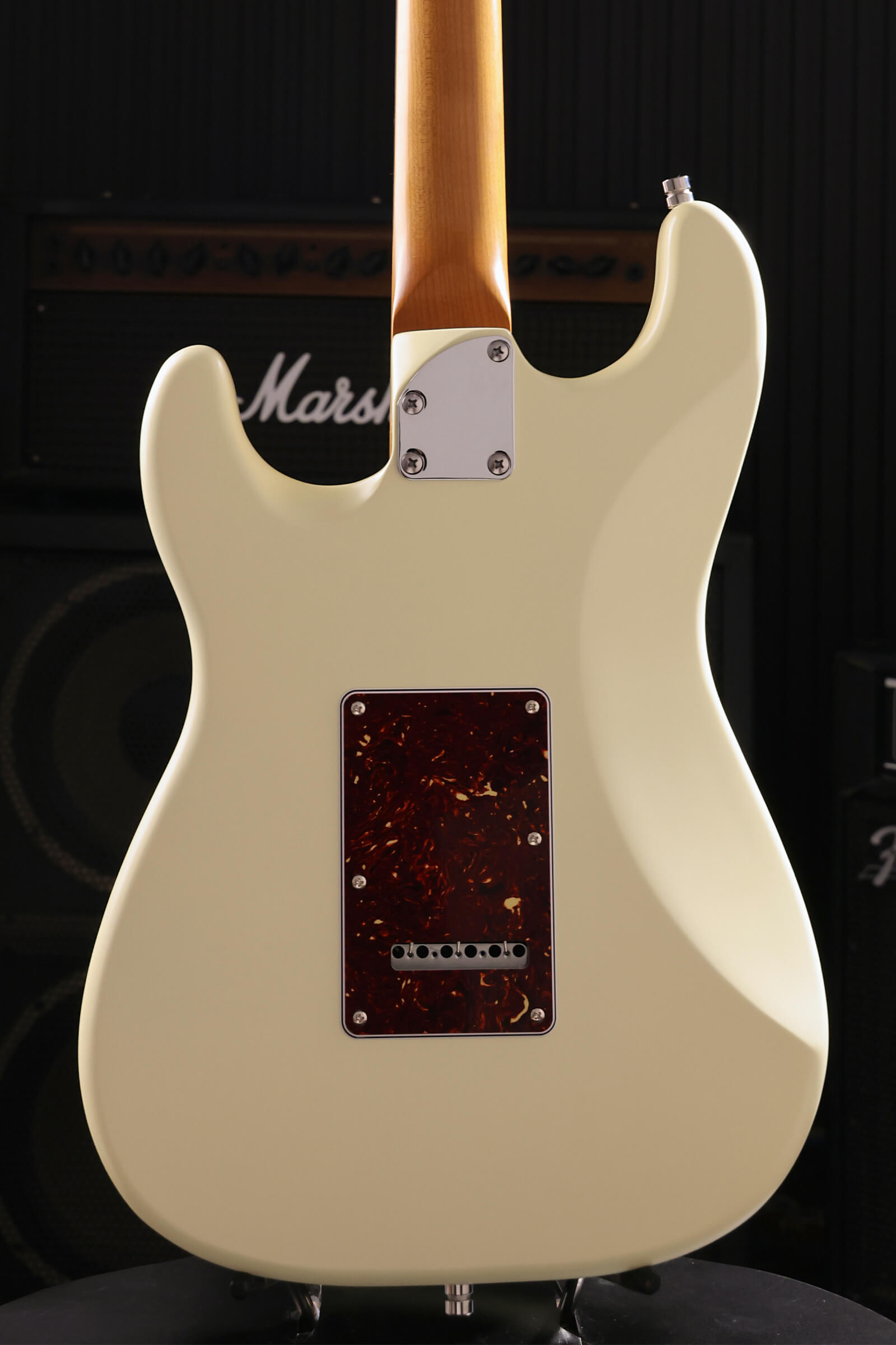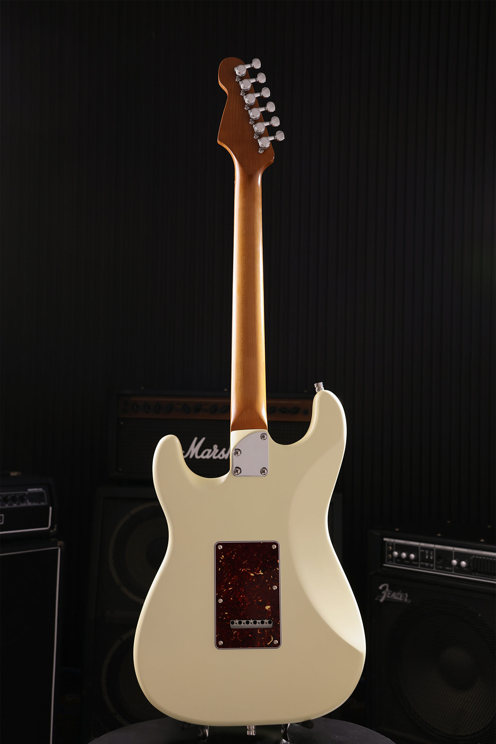The satin-finished roasted maple neck with rosewood board feels like an old friend from the first time you pick it up. Nitrocellulose lacquer over lightweight Paulownia means the guitar breathes and ages honestly, checking, wearing, becoming uniquely yours. Stainless steel jumbo frets that will outlast you. Tremolo stays stable and returns to pitch. Locking tuners hold through bends. Custom-wound Alnico V pickups deliver clarity and bite without harshness. Luminous side dots keep you oriented on dark stages.