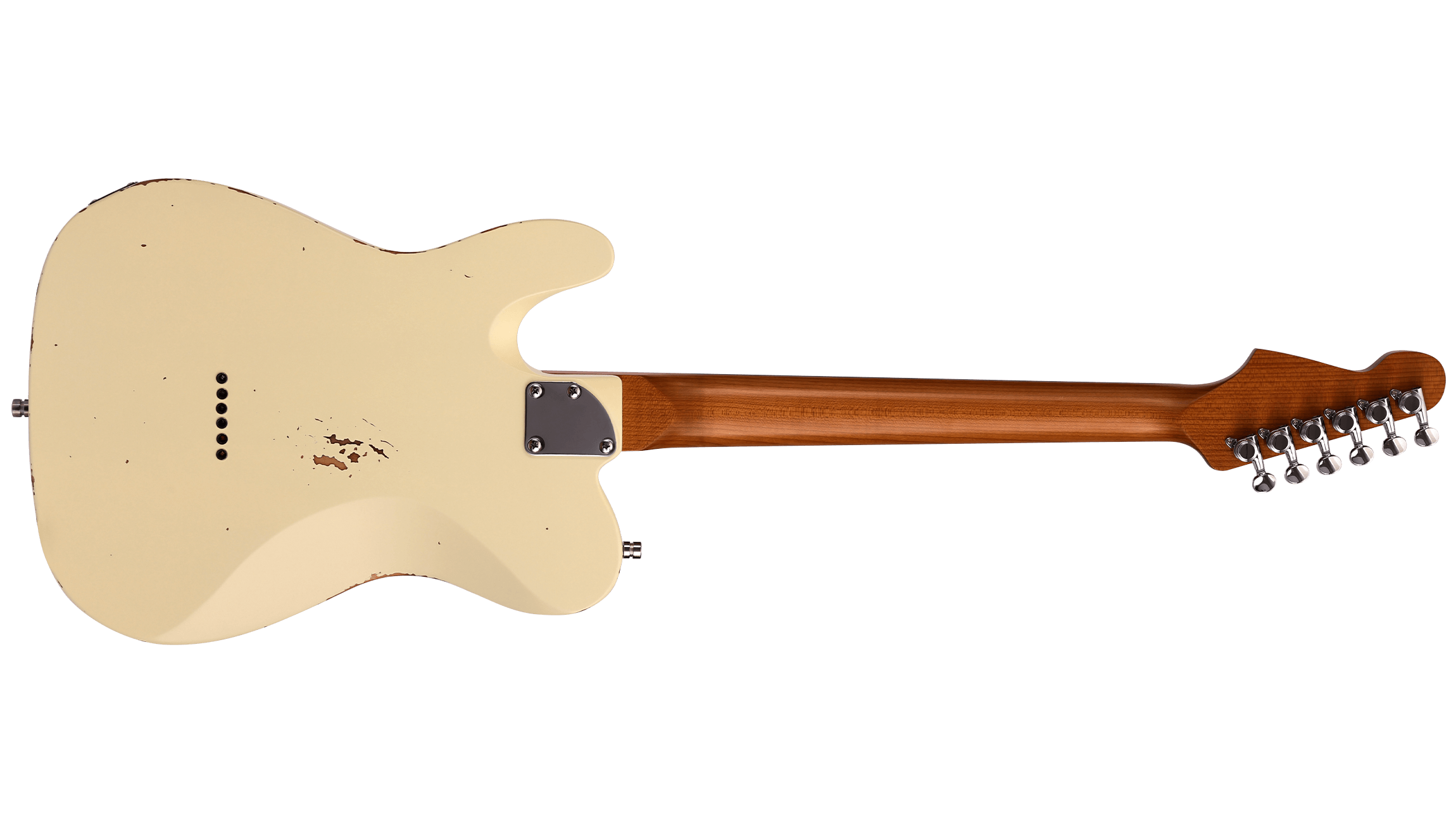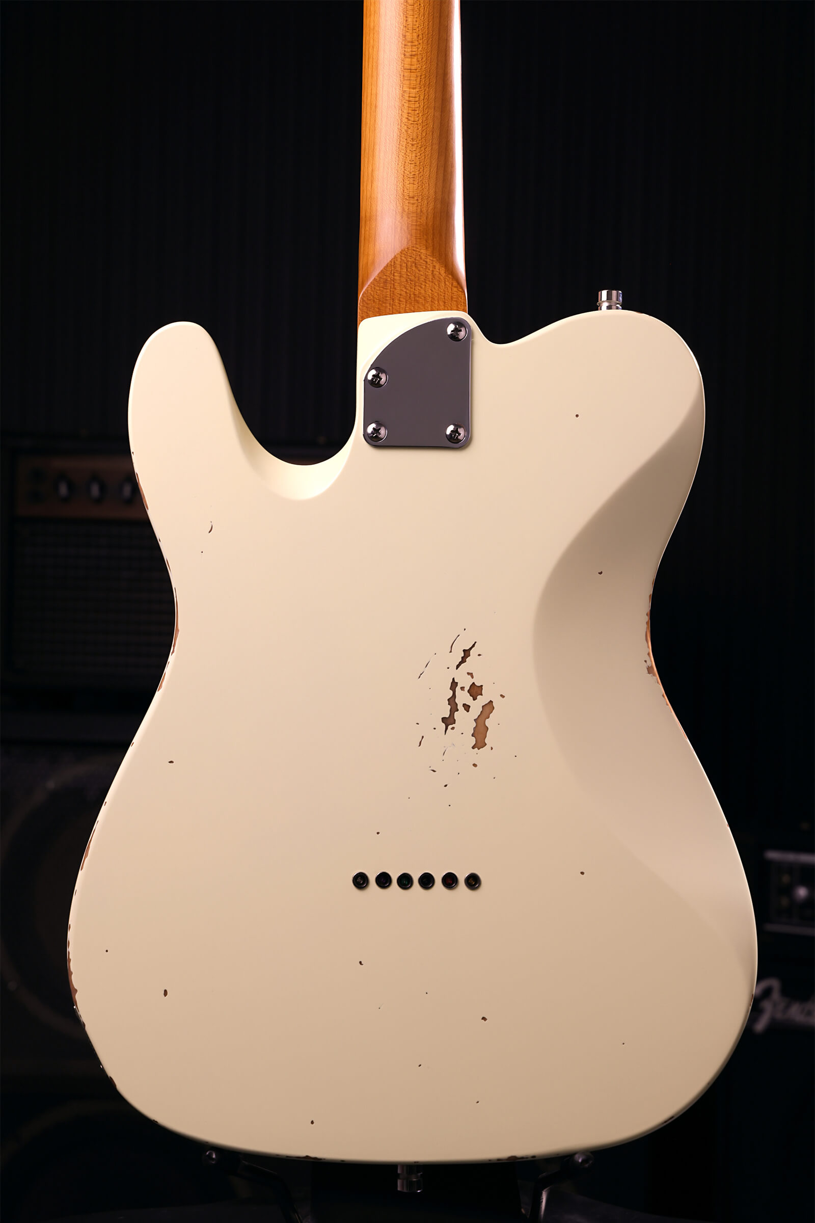 Aged nitrocellulose over Paulownia shows honest wear: checking, fading, character where it would naturally develop. The satin roasted maple neck with rosewood board feels comfortable from day one. Stainless steel jumbo frets won’t wear out. Custom-wound Alnico V pickups cut through without harshness. Locking tuners stay put. Luminous side dots for visibility when it matters.